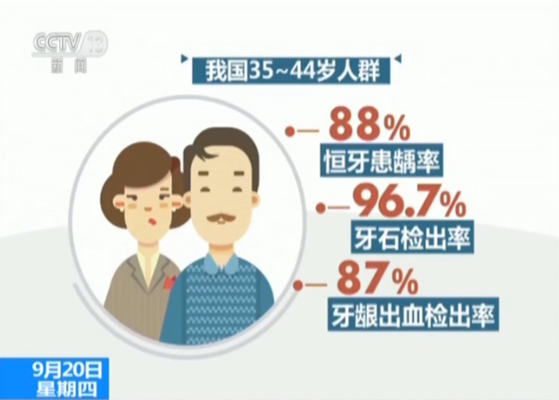 龋病、牙周疾病是损害口腔健康的常见病、多发病,我国35~44岁人群,恒牙患龋率为88%,牙石检出率为96.7%,牙龈出血检出率为87%。