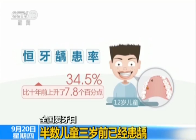 《第四次全国口腔健康流行病调查报告》显示,我国12岁儿童恒牙龋患率为34.5%,比十年前上升了7.8个百分点。5岁儿童乳牙龋患率为70.9%,比十年前上升了5.8个百分点。最值得注意的是,3岁儿童乳牙龋患率调查结果显示,一半以上的小朋友在3岁的时候已经患有龋齿。