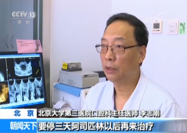 北京大学第三医院口腔科主任医师 李志刚:服用阿司匹林的病人,要治疗口腔疾病应该特别慎重。我们通常要求病人要停三天阿司匹林以后再来治疗。年轻的女性月经期的时候不要来医院拔牙,不要来医院做一些有创的治疗。