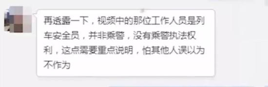 另外,爆料人强调,视频中的工作人员是列车安全员,并非乘警,没有执法权,并不是不作为。