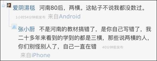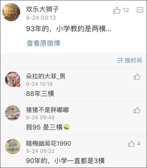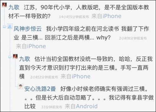 有网友分析说,可能是年代问题,写两横的都是70后80后。