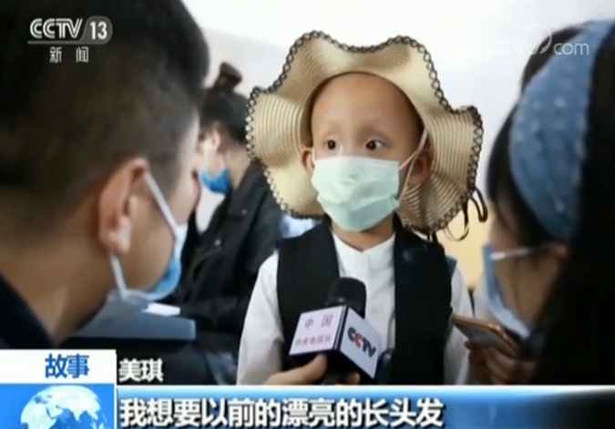 美琪妈妈 胡月:自从她头发掉之后,几乎她不回幼儿园了,在小朋友面前她都带着帽子,后来还好一点,刚开始的时候,在我们面前,睡觉的时候都带着帽子。