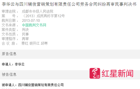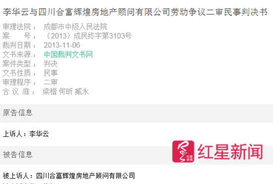 一审判决书记载称,法院经裁判文书网查询,李华云从2007年至今多次向不同的用人单位提起劳动争议诉讼。其中,李华云和案外人四川辅俊营销策划有限公司的劳动争议案中,辅俊公司陈述李华云利用公司地址变动事宜,向法院隐瞒公司地址,以公告送达的方式缺席判决,导致原审判决错误,李华云在该案仲裁委原审、一审、二审、再审庭审中,对主要证据《欠条》的陈述均不一致,相互矛盾。“除此之外,原告李华云还对案外人四川合富辉煌房地产顾问有限公司等多家公司提起劳动争议,多次在二审终审后提出再审申请。”判决书这样记载道。