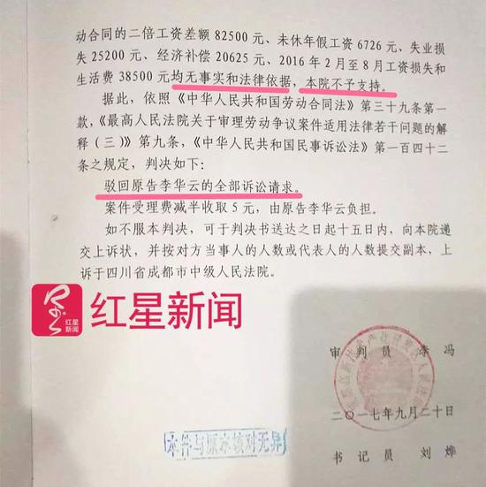 2017年9月,成都高新法院经审理驳回了李华云的全部诉讼请求。一审法院认定李华云违反了诚实信用原则,向法庭作出了虚假陈述,因此对于鉴定申请不予准许。“调查问卷可以自行制作,并不符合证据的形式要件,而视频资料仅能证明在公司办公场所出现过,并不能证明其为作为公司持续提供劳动。”判决书这样写道。