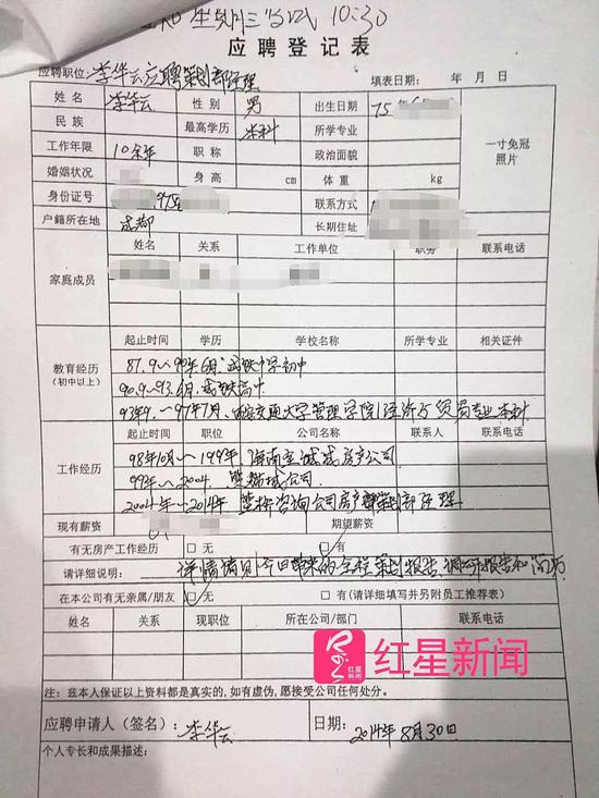 ▲卓为公司提供的李华云应聘登记表 受访者供图
