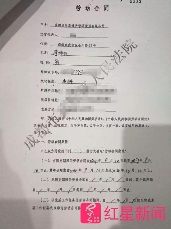 ▲李华云和卓为公司签订的劳动合同上显示,他的出生时间为“1975年” 受访者供图