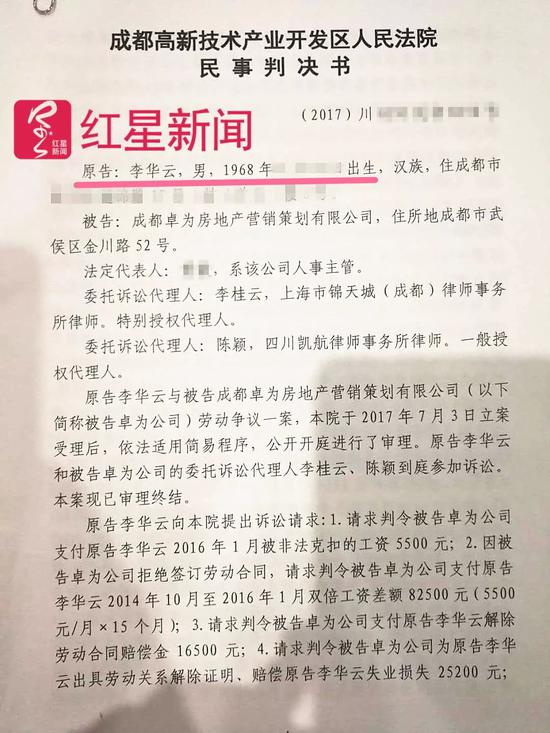 2017年,四川成都男子李华云将成都卓为房地产营销策划公司告到法院,要求卓为公司支付未签订书面劳动合同的二倍工资差额、未休年假工资、加班费、失业损失、解除劳动合同赔偿金、经济补偿、生活费共计18万余元,并请求法院确认直到2016年8月他和公司依然存在劳动关系。