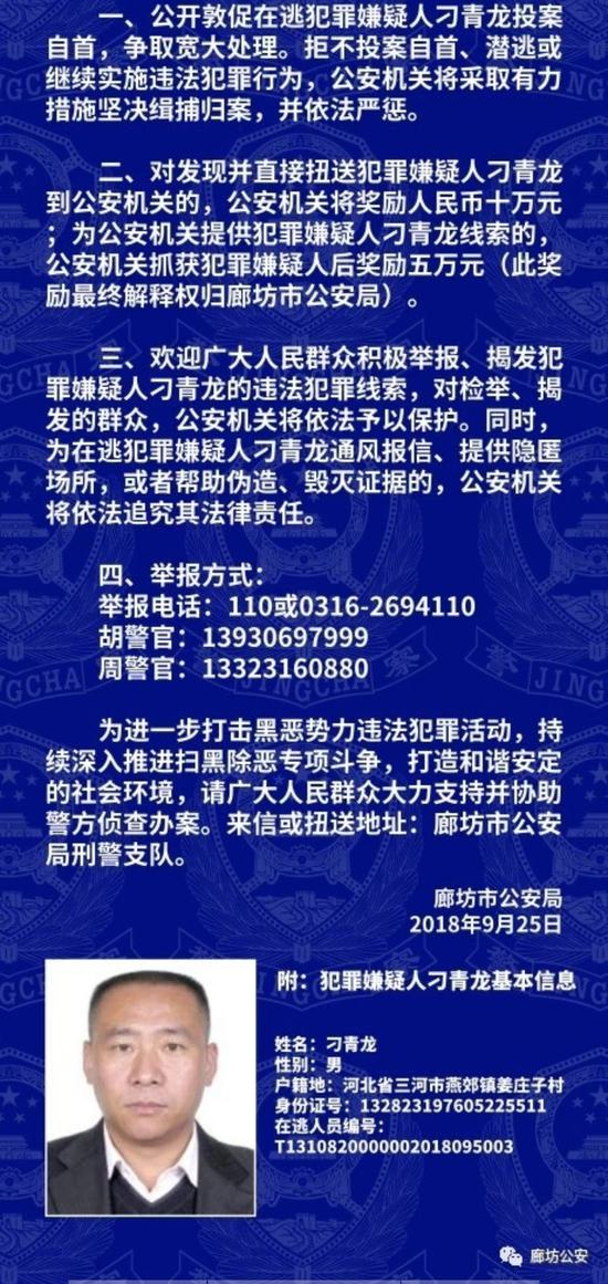 二、对发现并直接扭送犯罪嫌疑人刁青龙到公安机关的,公安机关将奖励人民币10万元。为公安机关提供犯罪嫌疑人刁青龙线索的,公安机关抓获犯罪嫌疑人后,奖励5万元(此奖励最终解释权归廊坊市公安局)。