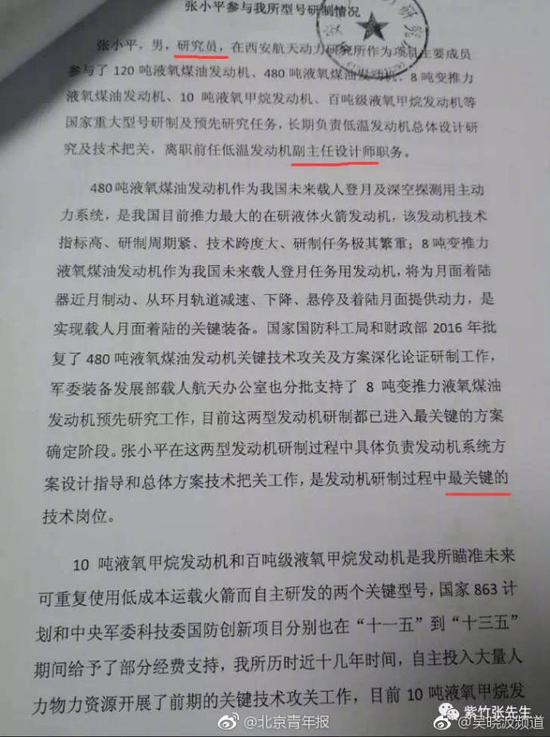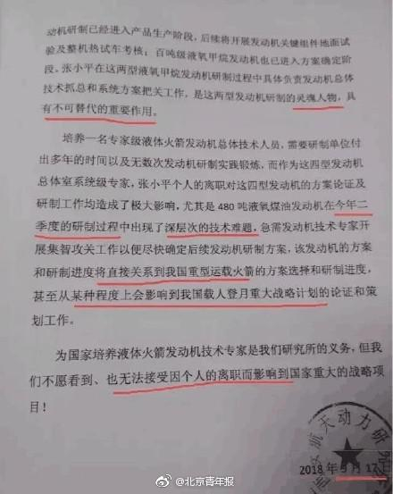[研究院:网传盖有公章的#研究员张小平离职#内容文件属实 系单位提交的劳动仲裁请求]近日,微博公号中一篇《离职能直接影 响中国登月的人才,只配待在国企底层?》的文章引发网友关注,文章中贴出了一份“张小平参与我所型号研制情况”的材 料的照片,在这份照片上,还盖有张小平原来所在单位的公章。