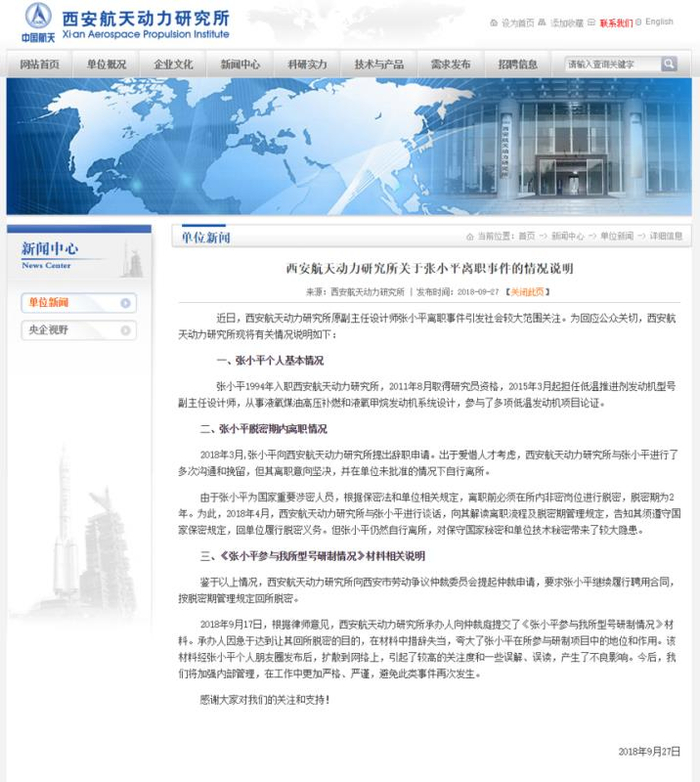 官方公告说明了张小平个人的基本情况及张小平辞职内情,称:“2018年3月,张小平向西安航天动力研究所提出辞职申请。出于爱惜人才考虑,西安航天动力研究所与张小平进行了多次沟通和挽留,但其离职意向坚决,并在单位未批准的情况下自行离所。”