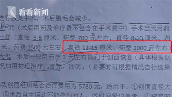 在这8500多元的费用单据中,标注了1680元手术费、340元治疗费,其他各项费用1000多,5000多元西药费。记者注意到,双方还签有手术同意书,其中提到,手术当天用药,根据皮肤汗腺多少面积大小不一样收费,直径5-8厘米,药费700元左右;直径8-10厘米,药费1100元左右;直径12-15厘米,药费2000元左右。