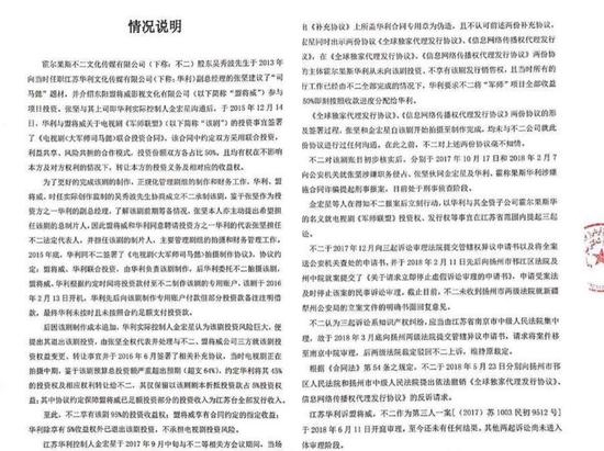 4、2017年9月,华利控制人金宏星于2017年9月中旬与不二等相关方会议期间,当场指出《补充协议》上所盖华利合同专用章为伪造,且不认可前述补充协议,要求不二将“军师”项目全部收益的50%即刻按照收款进度分配给华利,但当时所有的发行工作其实已经由不二全部完成。