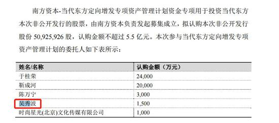 吴秀波最早与当代东方结缘是在2015年,当代东方拟通过非公开发行股份的方式收购盟将威公司。2015年6月,吴秀波以1500万元认购了当代东方超138万股,认购价约为10.8元/股。截至2018年6月底,持股比例为22.12%,是仅次于厦门当代的第二大股东。