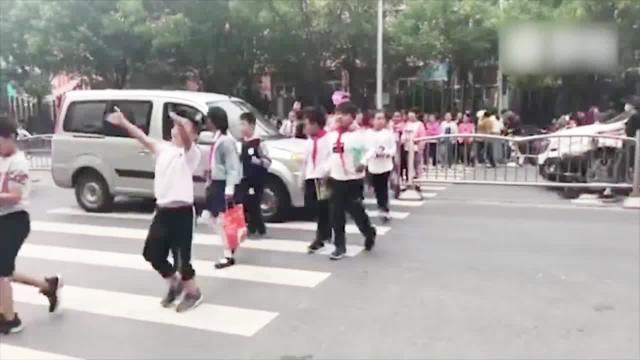 记者在谢女士拍的视频中看到,一群小学生欢快地通过斑马线,有车辆停在斑马线前等待,也有一辆电动车和电动三轮车从学生群中穿过。在靠近路中央护栏的车道内,一辆银色机动车在斑马线上缓缓行驶,与过往学生之间的距离极近,有的学生从车头前跑过。一名穿粉色上衣的女士看见这一幕张开双手,拦住后面的学生,让这辆车通过。