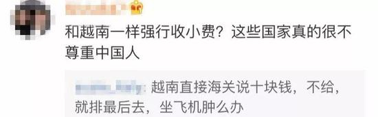 据报道,在排队过安检时,越南边检人员主动向他们索取10元人民币的小费,队伍中有一位带小孩的母亲拒绝给小费,这名越南边检人员竟然扣下了孩子的护照,要求母亲交100元才能出关,并向后面过关的中国游客索取30元小费,引起在场中国游客的不满。海关甚至向游客挥舞电击枪…