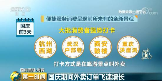 国庆前3天,便捷服务消费呈现前所未有的全新景观,大批消费者强势打卡杭州西湖、武汉户部巷、西安鼓楼、重庆洪崖洞等地,他们打卡的方式有点不一样,是在旅游景点叫外卖。