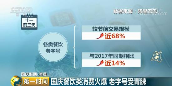国庆期间除了线上消费火热外,国内线下消费走势也很火爆。数据显示,十一前三天,各类餐饮老字号也成为了今年黄金周的赢家之一,较节前交易规模增长近68%,与去年同期相比也增长了近14%。