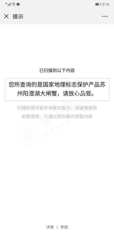 20只大闸蟹,四个工人不到十分钟便完成了洗刷、捆绑、系蟹扣的全过程,老板将包装好的礼盒拿给记者看,蟹扣都系好了,每个盒子里5公5母,记得蟹扣可以扫二维码查询,记者用手机扫蟹扣上的二维码查询,果然跳出一个页面,“您所查询的是国家地理标志保护产品苏州阳澄湖大闸蟹,请放心品尝。”