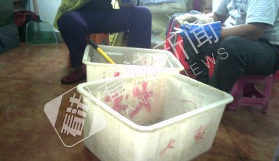 工人将刷好的闸蟹直接用绳子绑好再放回盆内,一位男工不知从哪里抽出一把塑料蟹扣一个个数,然后熟练地将蟹扣系在每一只螃蟹的蟹鳌上。