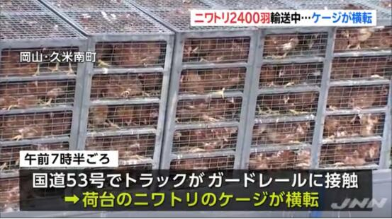 报道称,9日上午7时30分左右,在冈山县久米南町53号国道上,一辆装载2400只鸡的卡车撞上了护栏,致使鸡笼倾翻。鸡笼里的鸡顺势逃到车道和卡车下面。