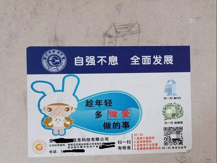 原标题:贵州民族大学自习室贴满“性暗示”广告,网友直呼“辣眼睛”