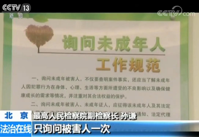 最高人民检察院副检察长 孙谦:在办案中,对未成年被害人进行有效的关爱和保护,我们要求办案的检察官,原则上只询问被害人一次,询问被害人一定要在专门的办案区域,采取适合被害人身心特点的方式来进行,同时呢,我们也向未成年被害人,提供司法救助、心理疏导、医疗等专业有效的帮助,开展法治进校园活动,加强未成年人防范性侵害的教育。