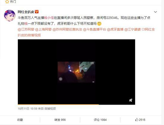 在其微博下方添加的一段视频显示,一位被博主“网红全扒皮”指认为是主播钱小佳的男子在马路边进行直播,当警车开过来时,他使用了粗鄙的语言辱骂警察。