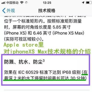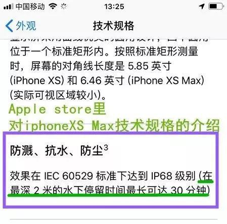 苹果新款iPhoneXS Max手机近日在中国上市,无论是Apple Store,还是苹果中国官网,都有介绍,IP68级别防水性能,在最深2米的水下停留最长可达30分钟。