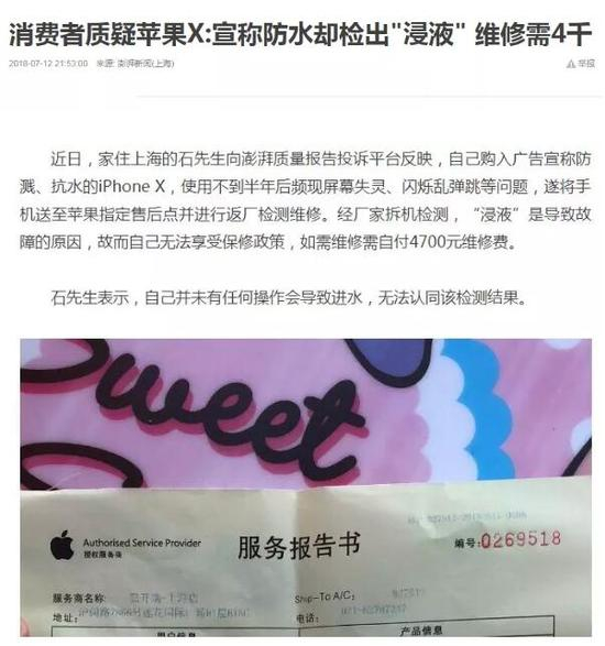 2018年7月份,上海的石先生反映,自己购入广告宣称防溅、抗水的iPhone X(宣称防水级别IP67),使用不到半年后频现屏幕失灵、闪烁乱弹跳等问题,遂将手机送至苹果指定售后点并进行返厂检测维修。经厂家拆机检测,“浸液”是导致故障的原因,故而自己无法享受保修政策,如需维修需自付4700元维修费。