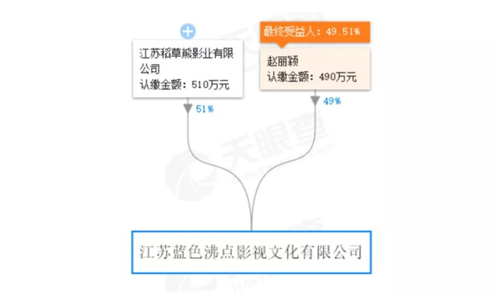 与此同时,赵丽颖也在布局着她的“股权投资路”。每日经济新闻(微信号:nbdnews)记者通过天眼查看到,赵丽颖共与6家公司有股权关联,其100%控股的南京赵丽颖影视文化工作室,还在江苏蓝色沸点影视文化有限公司(以下简称蓝色沸点)、北京海润影业股份有限公司(以下简称海润影业)、江苏稻草熊影业有限公司(以下简称稻草熊影业)等公司持股。