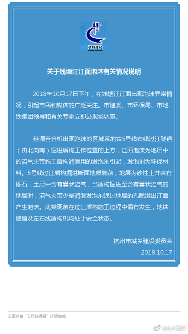 2018年10月17日下午在钱塘江江面出现泡沫异常情况,引起市民和媒体的广泛关注。市建委、市环保局、市地铁集团领导和有关专家立即赴现场调查。经调查分析出现泡沫的区域系地铁5号线右线过江隧道(由北向南)掘进盾构工作位置的上方,江面泡沫为地层中的沼气夹带施工盾构润滑用的发泡剂引起,发泡剂为环保材料。5号线过江盾构掘进断面地质复杂,地层为砂性土并夹有砾石,土层中含有囊状沼气,当盾构掘进至含有囊状沼气的地层时,沼气夹带少量润滑发泡剂通过地层的孔隙溢出江面产生泡沫。此类现象在过江盾构施工过程中偶有发生,地铁隧道及左右线盾构机均处于安全状态。