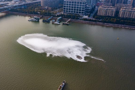 现场视频显示,在江面一侧的一块水域上泛起大量环形的白色气泡,气泡中心涌起波澜,浪花四溅。气泡周围,水上公安已乘船到达现场处置。拍摄者称,此水域下没有管道。另有视频显示,江面的白色气泡圈较为静止,没有明显移动痕迹。