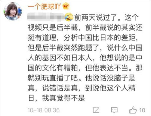 他说,当时他正在看一部抗日题材的科教片,也确实说了那句话:“从进化论的角度来说,中国人没有日韩进化得好;如果我是日本人,我也选择侵略中国”,但是,他马上又接了一句:“因为落后就要挨打,如果说想避免这种情况,那只能是自强不息。”