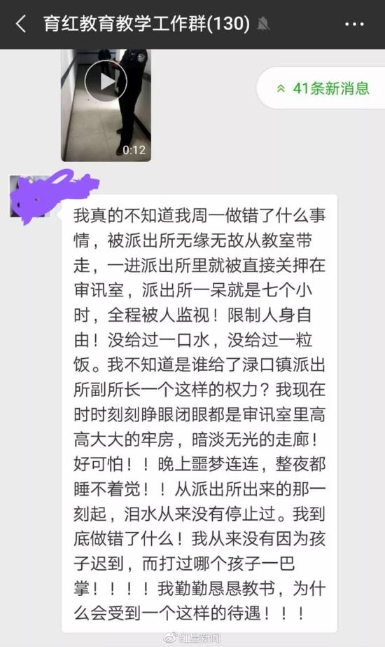 网传文章称,日前,因迟到,湖南株洲育红小学一名三年级女孩,被何姓女教师罚站数分钟。女孩父亲,株洲渌口派出所一副所长知悉情况后,驱警车直入学校,将何姓教师带走,并关入审讯室7小时。“全程被人监视,限制人身自由,没给过一口水,一粒饭……从派出所出来的那一刻,泪水从来没有停止过……我从来没有因为孩子迟到,打过哪个孩子一巴掌!我勤勤恳恳教书,为什么会受到这样的待遇。”