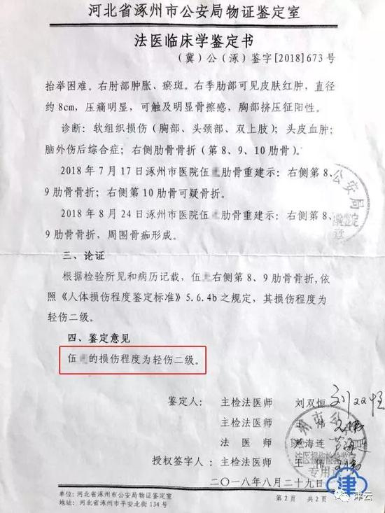 9月6日,仍未等到电话的伍医生又一次来到派出所询问鉴定结果,再一次向涿州市公安局投诉后,他于当日下午见到了自己的法医临床学鉴定书,他的损伤程度被鉴定为“轻伤二级”。警方再一次为他做了笔录,在做笔录的过程中,他看到殴打他的王某也来到了派出所。