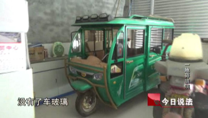 原来事故发生后,是杨廷聪的妻子梁金兰,把这辆电动三轮车从事故现场开回了家。梁金兰说在回家的路上刮擦到了一个人,然后玻璃就碎掉了。