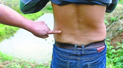 被红蚂蚁咬伤的王师傅背部有红肿 |