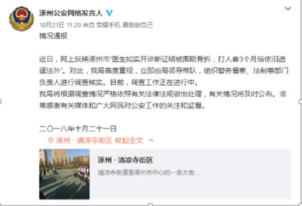 津云新闻报道后,涿州市公安局官方微博@涿州公安网络发言人于10月21日发布情况通报,表示对此事高度重视,并已组织警务督察、法制等部门负责人进行调查核实。