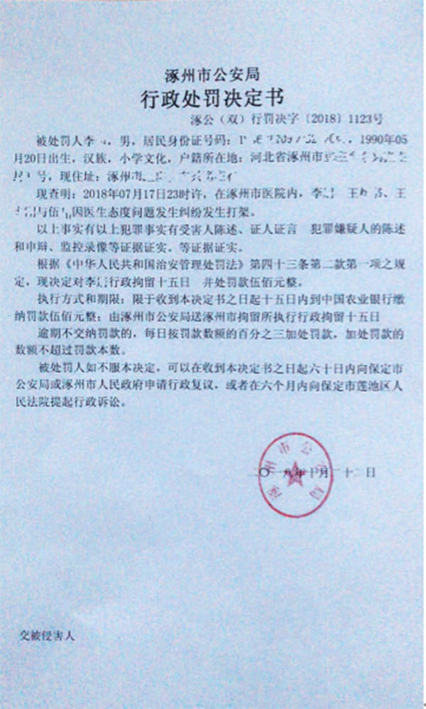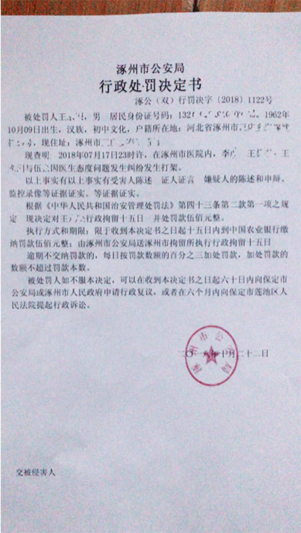 10月22日,涿州市公安局做出处罚决定,对当日参与殴打的患者王某、王某女婿李某处以行政拘留15日,并分别处罚款500元。
