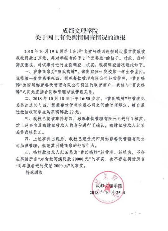 10月25日,成都文理学院发布《关于网上有关舆情调查情况的通报》。《通报》称,涉事商家“曹氏鸭脖”与学校之间无直接合同和管理与被管理的关系。同时,鸭脖款收取人纪某某非该校员工。经核实,不存在舆情所言“对食堂阿姨罚款20000元”的事实,也不存在舆情所言“对举报者进行奖励2000元”的事实。