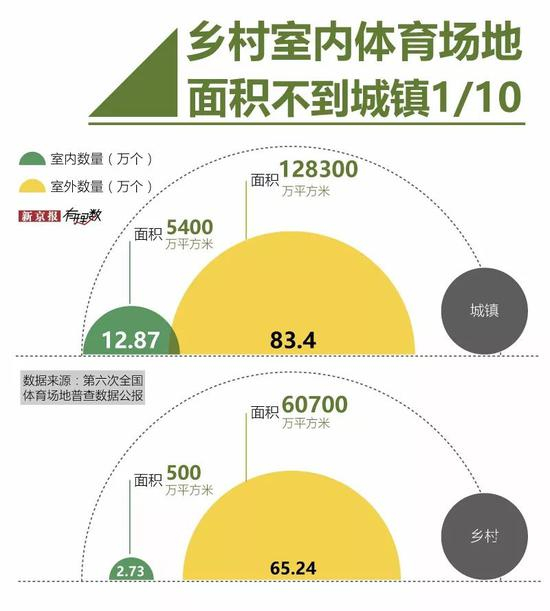 据国家体育总局发布的《第六次全国体育场地普查数据公报》,截至2013年12月31日,全国共有体育场地169.46万个,58.61% 分布在城镇,41.39% 分布在乡村,看上去城乡的差距也没多大对不对?