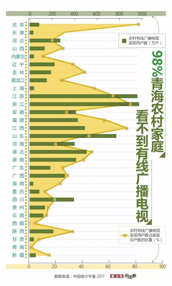 国家统计局数据显示,2016年,全国农村有线广播电视实际用户数为 8093.3 万户,占家庭总户数的比重的33.17%。换言之,将近2.4亿户农村家庭没有有线广播电视可看。