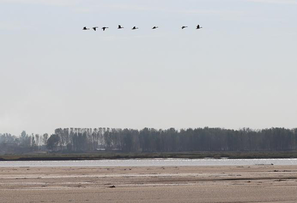 候鸟南迁的先头部队,已经陆续抵达我省黄河滩区。10月23日,记者不仅在长垣县黄河湿地内见到了大量的豆雁,在封丘陈桥村附近的黄河岸边,越过滚滚的打着旋涡的河水,能看到远处三角形沙洲上,几十只豆雁正在上下翻飞。