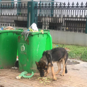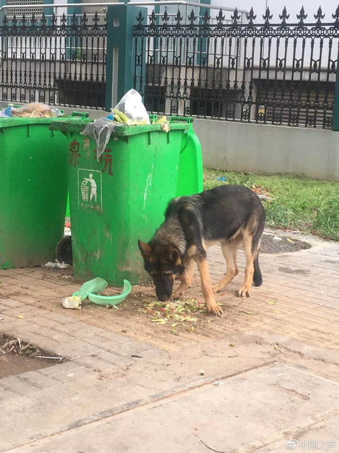 应女士:我做完月子第一次去散步,离派出所100多米处,有一排垃圾桶,它在刨垃圾吃。