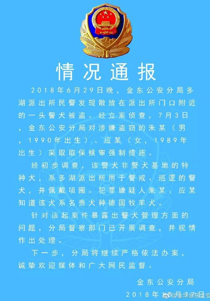 通报称,今年6月29日晚,金东公安分局多湖派出所民警发现散放在派出所门口附近的一头警犬被盗。经立案侦查,7月3日,金东公安分局对涉嫌盗窃的朱某、应某采取取保候审强制措施。经初步调查,该警犬非警犬基地的特种犬,系多湖派出所用于警戒、巡逻的警犬,并佩戴项圈。犯罪嫌疑人朱某、应某知道该犬系名贵犬种德国牧羊犬。针对该起案件暴露出警犬管理方面的问题,分局督察部门已开展调查,并视情作出处理。下一步,分局将继续严格依法办案,诚挚欢迎媒体和广大网民监督。