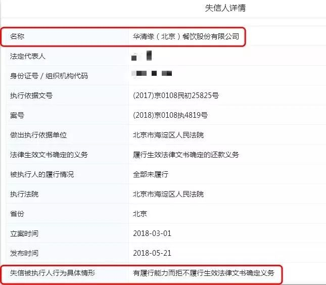 华清缘公司被北京市海淀区人民法院公示为失信公司。