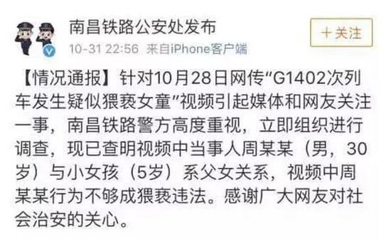 据江西南昌铁路警方通报,经调查后证实,“G1402次列车发生疑似猥亵女童”视频中,当事人周某某(男,30岁)与小女孩(5岁)系父女关系,视频中周某某行为不构成猥亵违法。