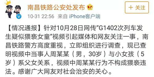 最近,一则拍摄于高铁上的视频在网上刷了屏,内容简直“辣眼睛”!一位黑衣男子抱着一个五六岁的小女孩,撩起女孩的衣服,不断抚摸、亲吻她的背部、脸部、颈部,小女孩一直都很抗拒,试图挣脱……引人注目的是,10月31日22:56分,南昌铁路公安深夜发布了情况通报,再度引得舆论哗然。