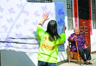 95岁的胡冬英奶奶独居,看到天气很好,想把被子晒晒,打电话到社区,社工立即上门帮老人晒被子。胡奶奶连忙夸赞“社区服务真贴心,社工都很热情,既有耐心又有爱心。想买点什么东西,修个什么东西,一个电话都能解决了。”