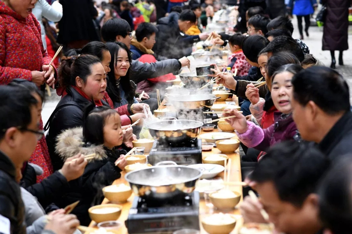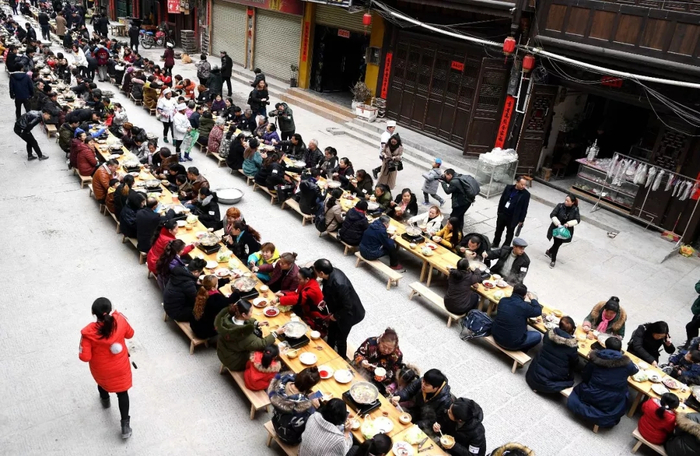 △2月3日,贵州榕江县城石板古街庖汤长街宴。/视觉中国